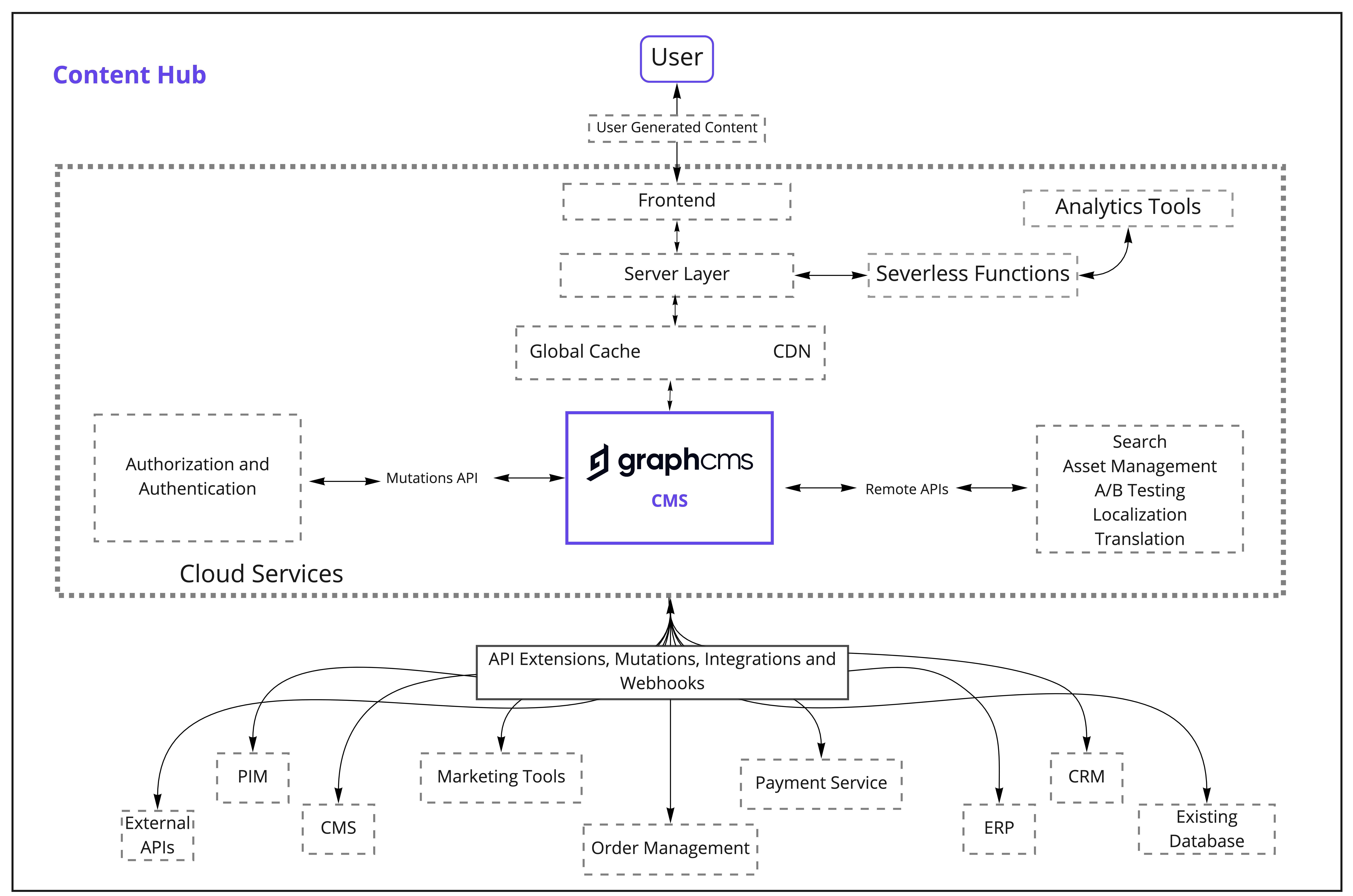 During the beginning phases of creating a modular, API-first tech stack, it can be difficult to see the big picture of how all of the pieces work together. That’s why we have created some high-level architectures which will give you a place to start your evaluation and guide you on some things to consider when building a modular, API-first tech stack.